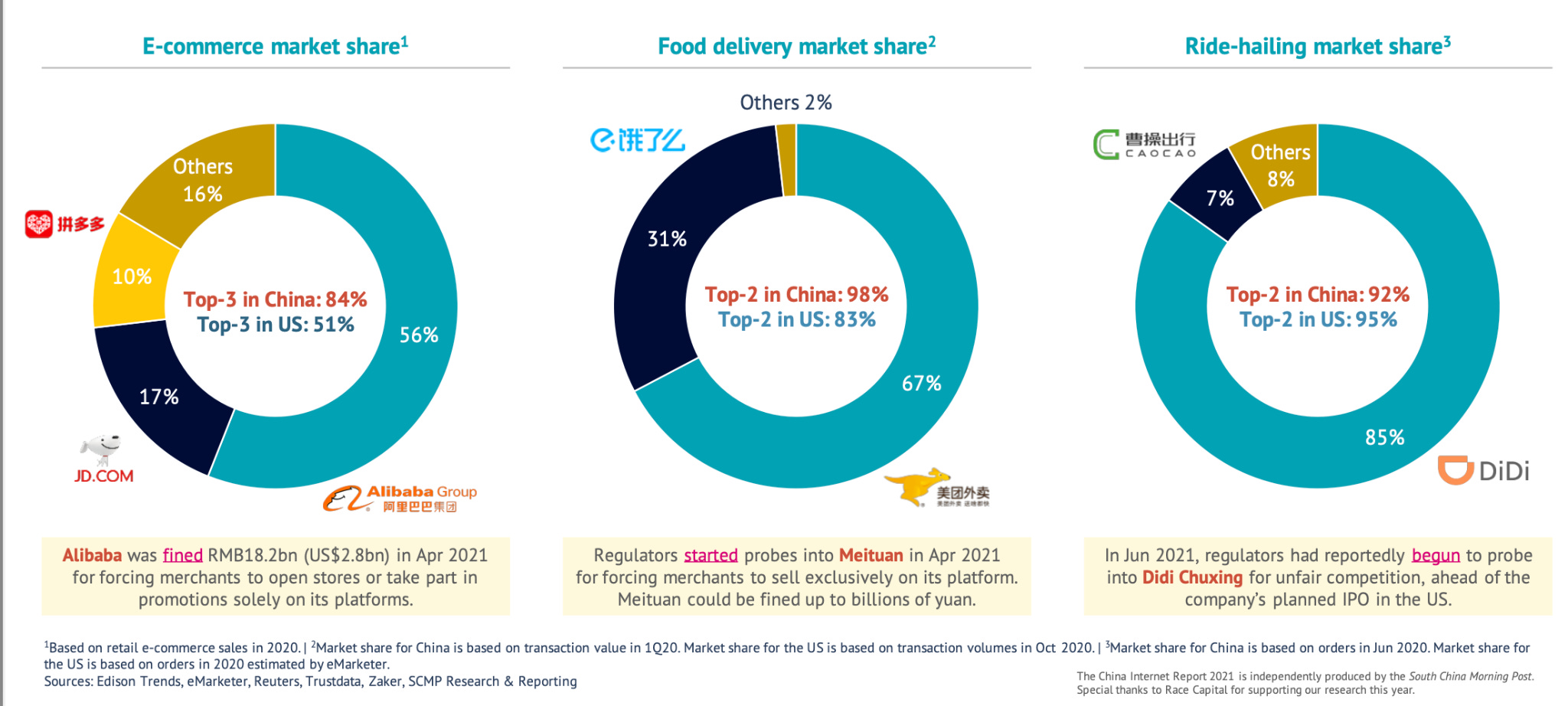 Siete empresas se reparten el bacalao del e-commerce, el delivery y los rides: Alibaba, Tencent, JD, Pin Duo Duo y Meituan (se hicieron fuertes en “pueblos” de menos de 10 millones de habitantes) y Didi (compraron Uber en China y ahora entran a competir también en LATAM)…
